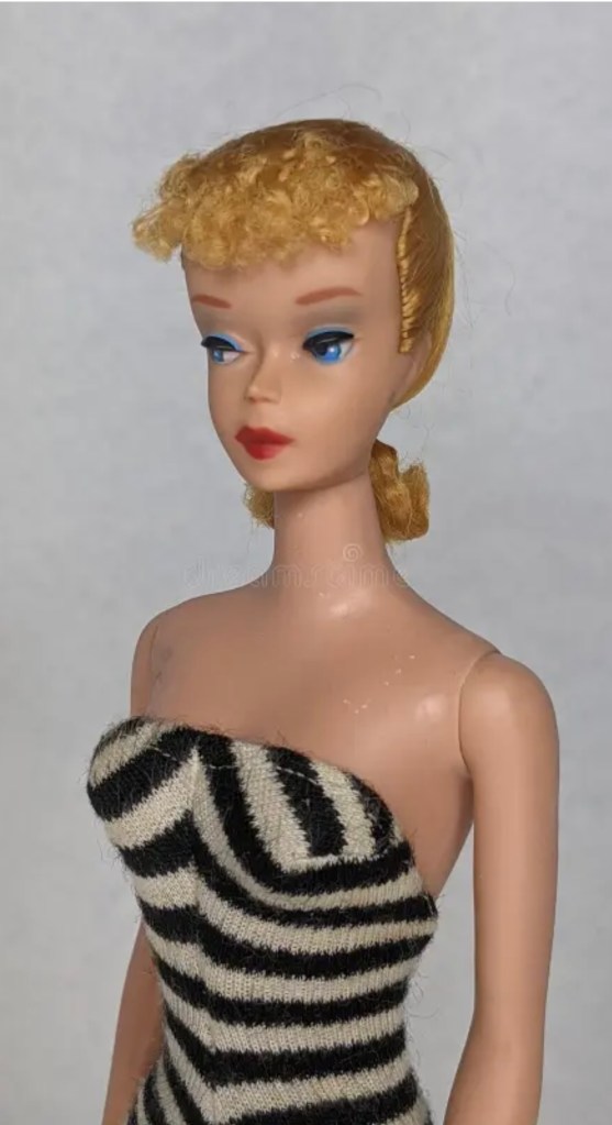 I specifically remember playing with one of the earlier vintage models that came out in the 70’s that I was so enamored with as I admired its perfect cat lined eyes and cute blue pencil skirt paired with a red and blue striped crew neck shirt outift it came in. My siblings, cousins and neighbors would also bring their Barbies as we set up to play continous rounds of “house”.