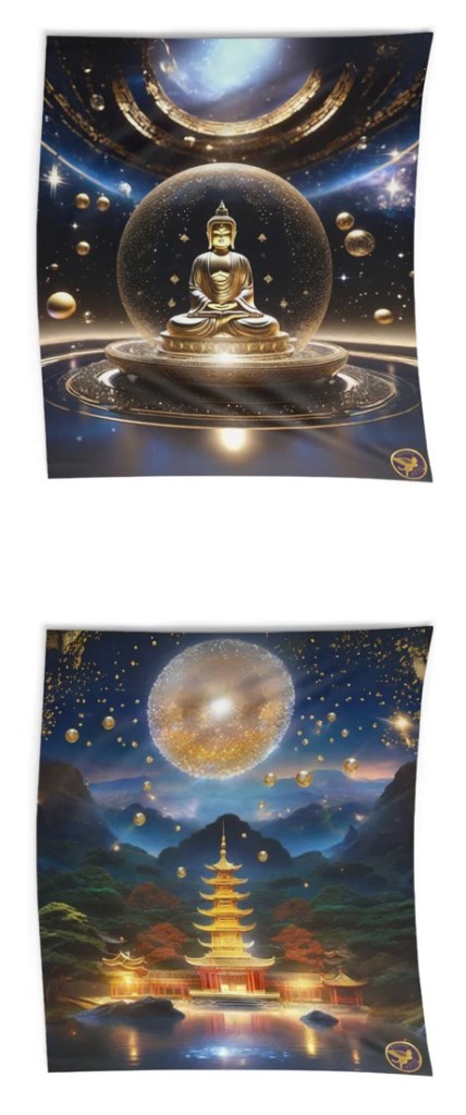 Buddhist Diamond Sutra Art Tapestires are the latest release. The print carrier would only allow printing for the largest size available, 104″ x 88″ so this would be suitable for adorning a wall in a spare room converted for meditation, prayer and spiritual reflection, journaling, practicing healing arts or to decorate a libary or reading room. It may also be framed or fitted and hung on wooden slats and is made of fade resistant long lasting polyester. It’s also nice to stare at until the third eye becomes merry. 🪷