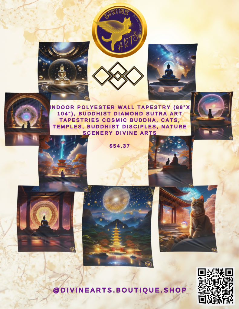 And this is the second book DA released, Love & Light 2: Three Tales of Water in the Making Breaking of Civilizations, Divine Arts BookstoreThis is my favorite line created so far as they stem from transmutation of 💩 to the treasure of wisdom & knowledge. They reflect much of what the collective consciousness is undergoing in the awakening process in the shift to a higher vibration of consciousness as Earth aligns to a 5D timeline in this transtion to a real Milennial Golden Age Heaven on Earth now. Individual & collective upgrades in consciousness are mutually beneficial & supportive in this turbocharged cosmic history in the making! : ) Correction: The link should be divineartsboutique.shop ; )This should be my favorite line that I created though as it radiates merkaba light body art that I love so much, esp. bc it can assist individuals and collectives to transmute and heal trauma therefore aid in the decluttering process towards spiritual and energetic hygeine necessary for ascension. ✴️✨ The merkaba is a key ascension tool gifted to each life form (there are planetary merkabas too so Earth also has a merkaba) as it is used in creating a Maharaic life shield that protects the chakra gateways in ascending to higher states of consciousness.This is the Divine Arts Diamond Sutra tapestry line. The print provider, Printify would only provide the 88″ x 104″ option with 3 other smaller sizes excluded after I already loaded my design templates too! But I wanted to share the cool art here and relevance of the message of sunyata or what Buddha mentioned is the emptiness of all phenomena that is the cornerstone of Buddhist teaching. For reference, the last stanza of the Buddha’s most popular wisdom teaching reads, “All phenomena is like a dream, an illusion, a bubble and a shadow, like dew and lightning, thus should you meditate upon them”. So, it means to not get stuck or hung up on anything. All events are just passing phenomena afterall and inherently empty so while it’s important to remain cool and detached, each should also hold space for endless compassion to grow oneself as the bridge to connecting with the divine within as well as understanding the grandness of life in external phenomena as well. 💠Divine Arts Monthly Giveaway: While this flyer was created for the small business event where the winner was drawn and announced earlier today, DA will be hosting monthly giveaways you can also participate in. If you subscribe, like and comment on a post on the blog, socials or upcoming 5D supersite (crossing fingers to soft launch it in a few months), you can also enter to win any prize in the Divine Arts Boutique. For those online, you can email your entry by the 3rd of each month to divineartsstore@gmail.com and include a screenshot of your subscription and comment. Winners will be announced by the 5th of each month and if you are drawn as the winner, your light codes gift will be mailed within 7-10 business days to the address you specify. By entering, you also agree to send a screenshot with you and your light code prize to be posted on DA socials. You can also connect with DA socials for future giveaways.The ascension greeting cards include my favorite Sufi mystic, Rumi poems that are based on mystical divine love that is very much based on intuition hence instinct. : ) ❤️✨🪽Froopy checks out what cat momma is up to with the retail rack as the last piece to prep to be ready for the event