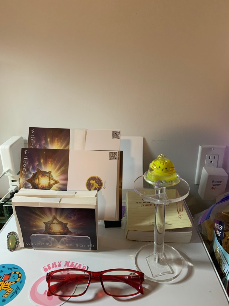 special ascension pod is set next to the 5D greeting cards that I just designed for Divine Arts. Froops’s will have spent 4y on Earth in March with me as I celebrate my 50th then and it will be a