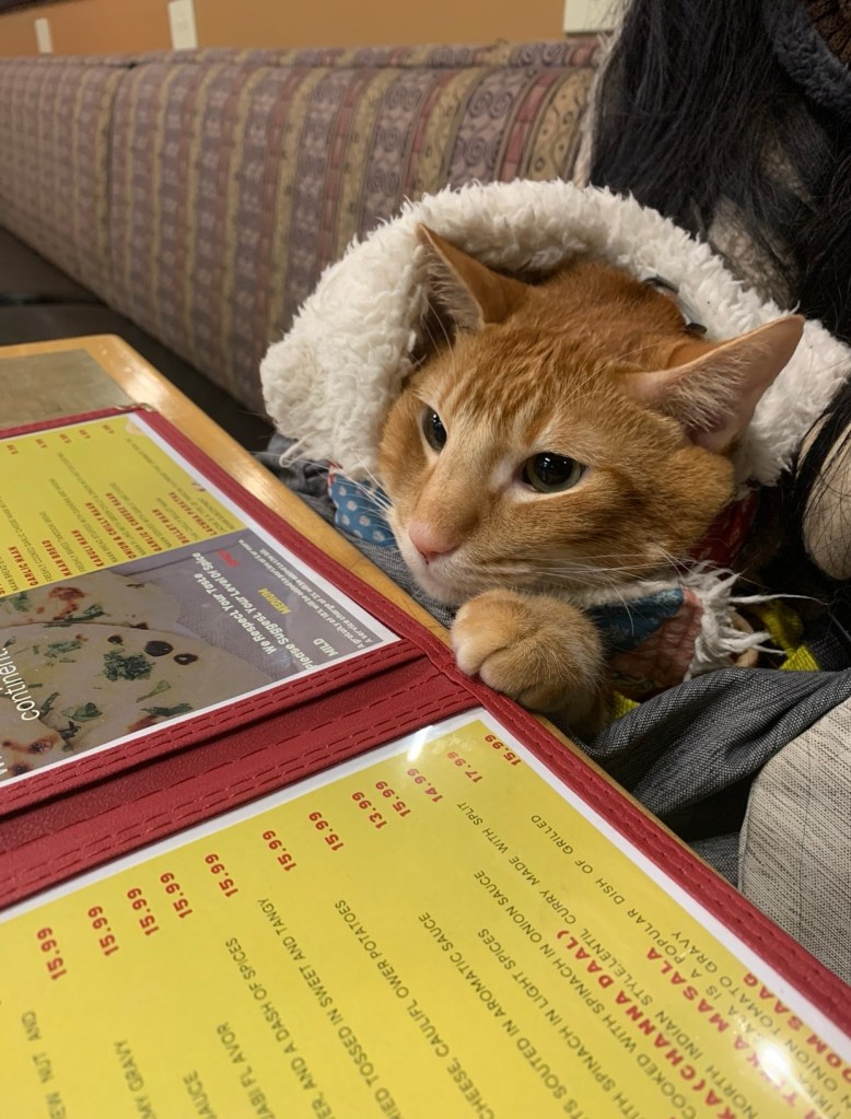 I let Froopy order first at this very spicy Indian restaurant in downtown Portland to commemorate his flamey tabbiness (so amazing the ethnic cuisines here!).