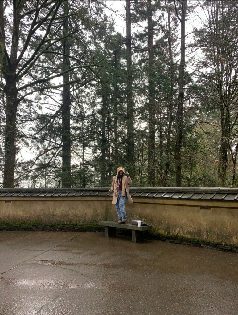 Japanese garden, Portland, OR: Got into tribal mode from feeling the raw power and beauty of nature here at the Japanese garden lookout point (also close to Hoyt Aboretum)… I think the sloth hat encouraged the return to natural roots giving cause to celebrate. : )
