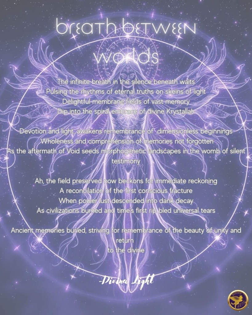 “Breath between Worlds” is a dedication to the intact memories held in Lyra pre-fall of the Lyran-Orion wars by eternal light beings who weaved the Akasha fields of memory in that neighborhood of the universe.  It is a promise that before the first fracture in consciousness in this universe due to these  wars that lead to the fall of man and its spiritual descent thereafter, the memories of intergalactic agreements, soul-vows, beings, civilization collapses, etc. would be held in place in a non-dimensionalized timeless place in the universe as a bookmark where these memories may be recovered to repair and restore soul memories and connections to the cosmic self.
