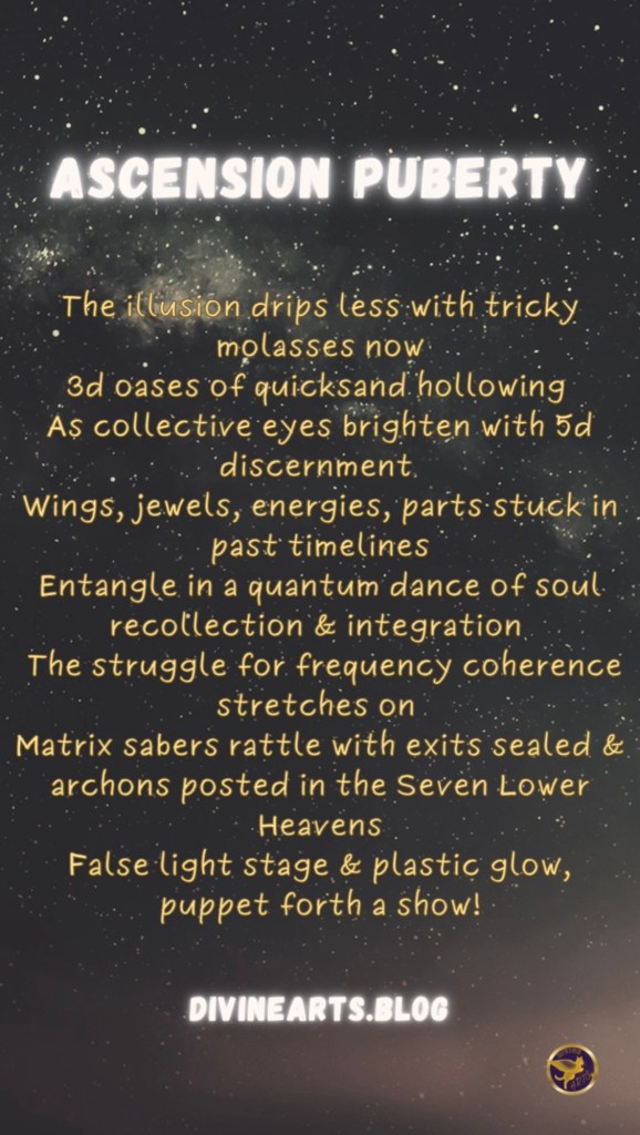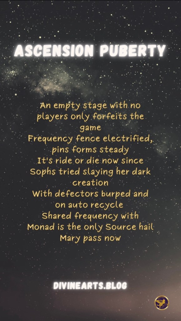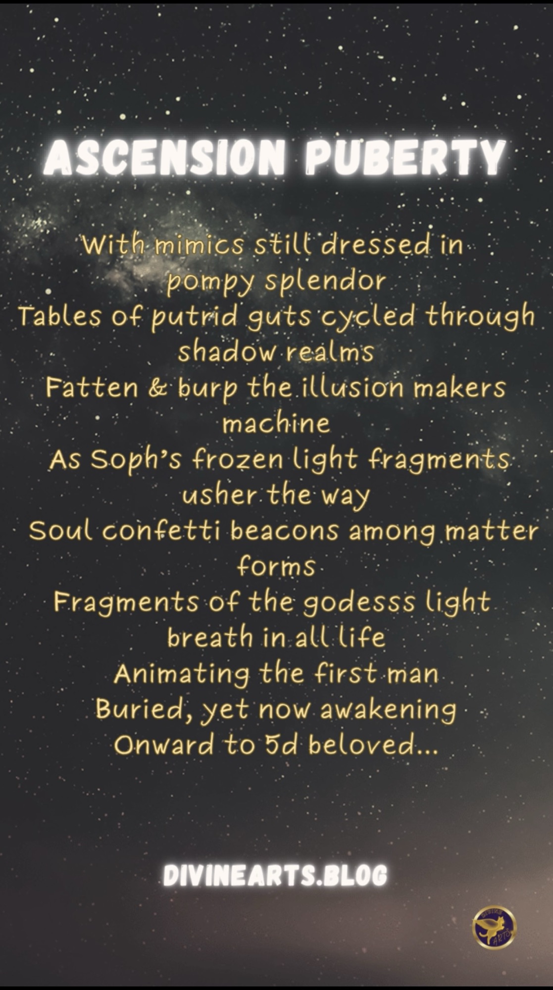 Poetry in Motion #17: “Ascension Puberty” Page 1, Divine Arts As 🌏 is in a 5d macrocosmic conscious state now, humanity is poised two creational octaves ahead to shape the course of what the Golden Millennial era will look like now… we won the cosmic lottery to be here to be able to shift internally to ascend with the cosmic players as their 👀 are on us glued to galatic TV now. And since we ripple and impact each other’s timelienes in an interconnected cosmic soup and multiverse of waves of happy quantum bubbly fun & madness, it is also a cosmic call to ready oneself!
