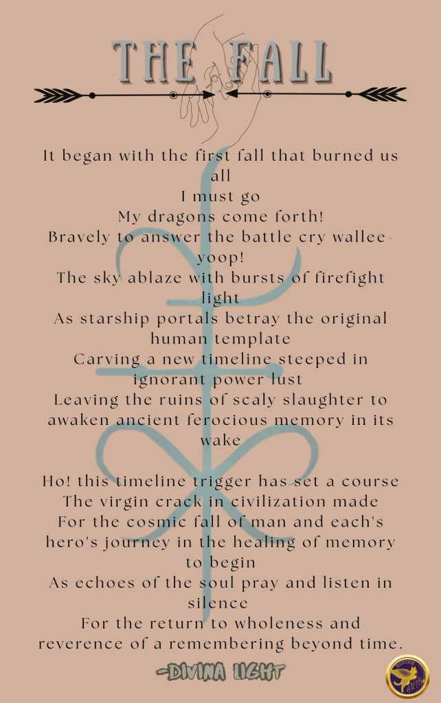 The next three poems titled, “The Fall”, “Archive of Silent Stars” & “Breath between Worlds” are a dedication to the intact memories held in Lyra pre-fall of the Lyran-Orion wars by eternal light beings who weaved the Akasha fields of memory in that neighborhood of the universe. It is a promise that before the first fracture in consciousness in this universe due to these wars that lead to the fall of man and its spiritual descent thereafter, the memories of intergalactic agreements, soul-vows, beings, civilization collapses, etc. would be held in place in a non-dimensionalized timeless place in the universe as a bookmark where these memories may be recovered to repair and restore soul memories and connections to the cosmic self.