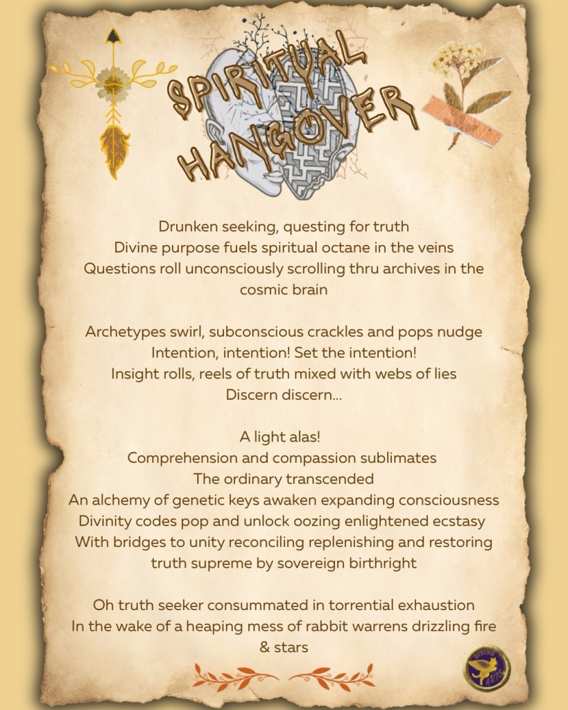 And also quite nicely, at the conclusion of these fervent quests, I often find myself utterly spent though with a sort of cerebral O (gasm!)… 40 browsers and video screens later in the aftermath of strewn notes in “organized” disarray and an exhausted trail of warrens of tunneled rabbit holes left in the wake of a mind high returning to base “reality”… yup, oh the spiritual hangover. π€€